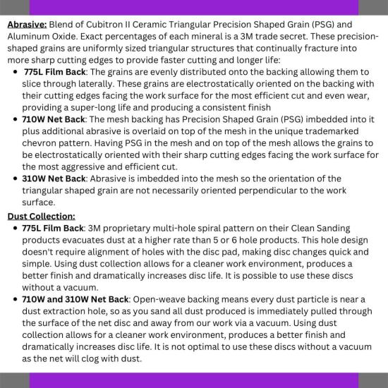 3M™ Cubitron™ II Xtract™ Hookit™ Clean Sanding Net Discs feature 3M™ proprietary Precision Shaped Ceramic Grain, a revolutionary advancement in abrasive technology. The sharp, triangular shaped ceramic mineral is designed to slice through the substrate, rather than gouging or “plowing” like conventional abrasives, resulting in a disc that cuts up to 2x as fast and lasts up to 6x as long as conventional abrasives.