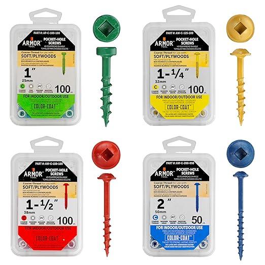 350 Piece Coarse Thread Color-Coat Screw Set comes with 100 - 1", 100 - 1 1/4", 100 - 1 1/2", 50 - 2" Coarse Thread Screws. Coarse thread pocket hole screws are designed for softwoods....More Details
