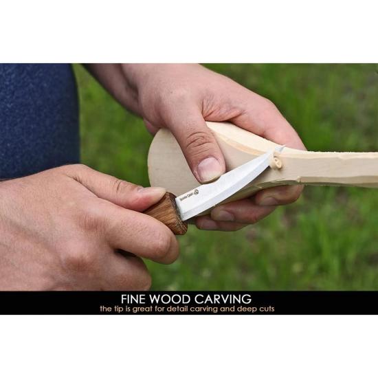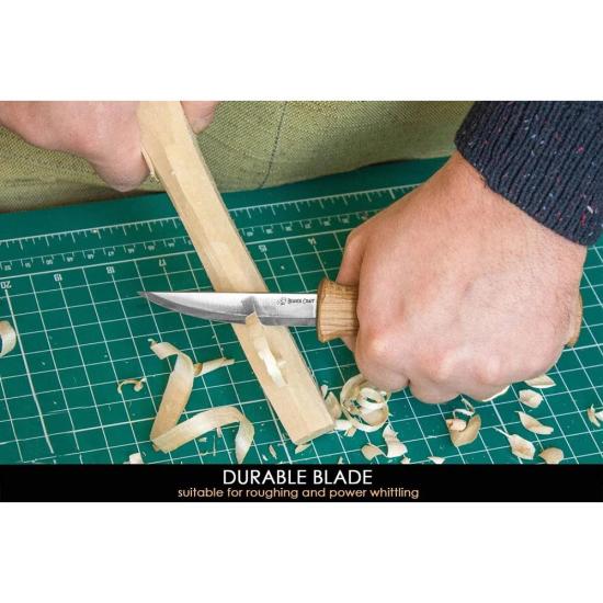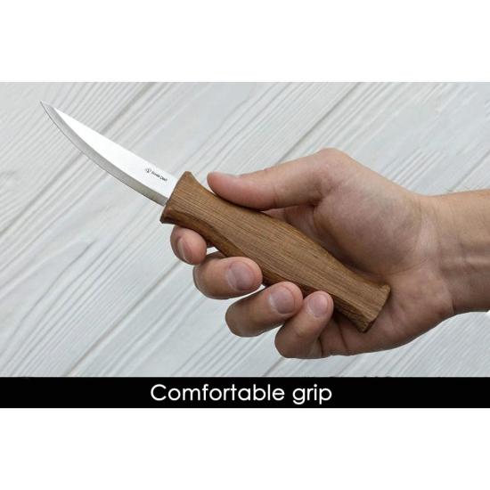 Crafted from high-carbon steel, the blade is well-sharpened, guaranteeing effortless and precise cuts. The handle, made from oak wood and coated with natural linseed oil, provides a comfortable and secure grip. Its ergonomic design ensures a pleasant feel in your hand, making extended carving sessions fatigue-free.