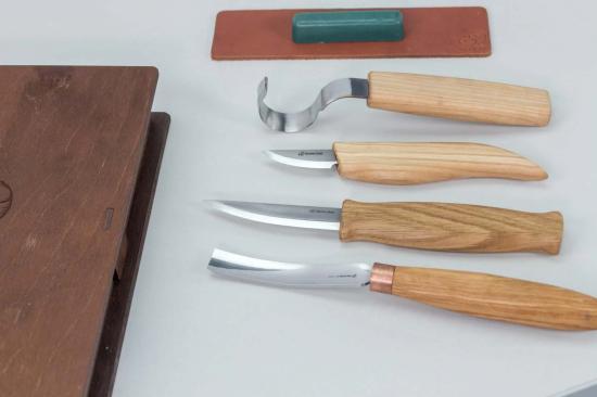 In addition to the carving tools, the set includes a leather strop and a green-gray polishing compound to help maintain sharpness and extend tool life.