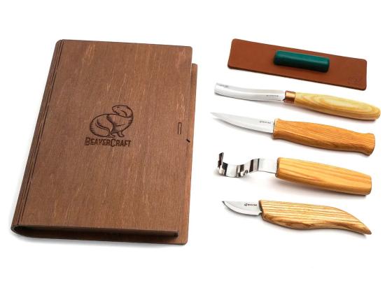 BeaverCraft 4 Piece Spoon and Kuksa Carving Set with a Strop in a Book Case