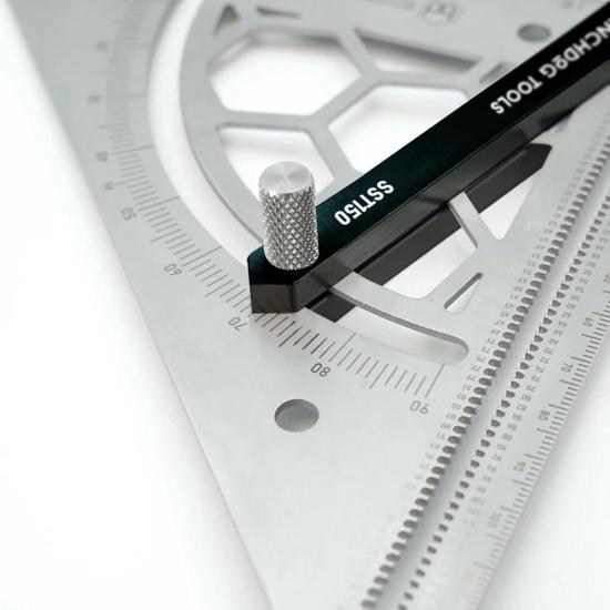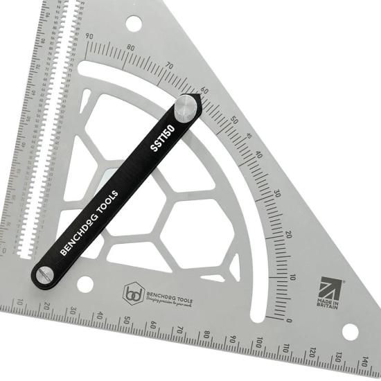 The blade of the Benchdogs bevel square is 1.5mm of stainless steel for precise markings without the parallax often found with thicker blades. An aluminum handle in a fixed position is attached to the blade, with the other end machined to a point. The blade is also laser marked with an mm scale, allowing for precise angle measurements to be taken and set accurately.