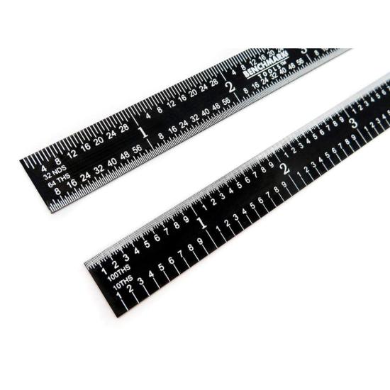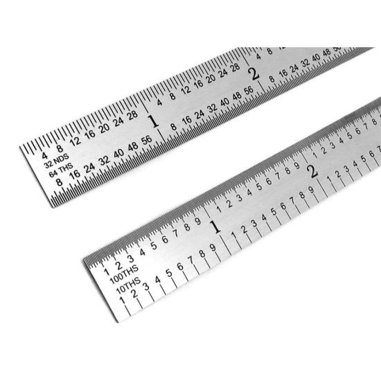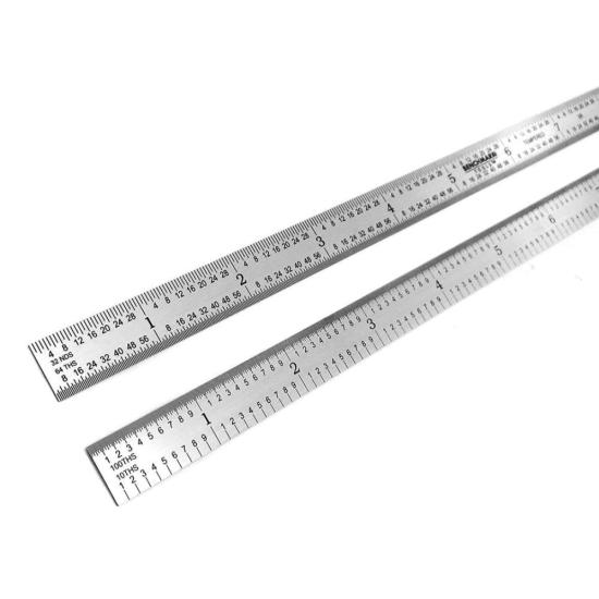 A good quality machinist rule is an indispensable tool used by machinists, woodworkers, architects, draftsman, scientists, students, DIYers and more. When used correctly, a good steel rule is a surprisingly accurate measuring device. These rules are made from Japanese rust-resistant stainless steel that has been tempered creating a measuring tool that can flex if needed but will snap back straight. The edges and ends have been ground parallel, straight, smooth and square. Graduations are produced via a photoengraving process creating very consistent and accurate markings with uniform line widths. Once etched, graduations are black filled for easy readability. Graduations are etched and not printed so will not wear off with prolonged use. Graduations conform to strict international EEC 1 Accuracy Standards, i.e. +/- 0.2mm at 20° C for 1000mm ruler. 5R graduation marks feature quick-reading 32nds and 64ths on one side and 10ths and 100ths on the reverse side.Each rule comes in vinyl storage pouch.