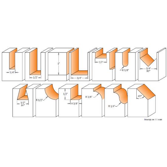 Containing 13 of CMT’s most frequently used 1/2" shank router bits featuring the finest steel and carbide, plus CMT’s baked-on orange PTFE non-stick coating, this compact Italian case is beautiful and convenient for your woodworking needs. You will have exactly what you need within hand’s reach.