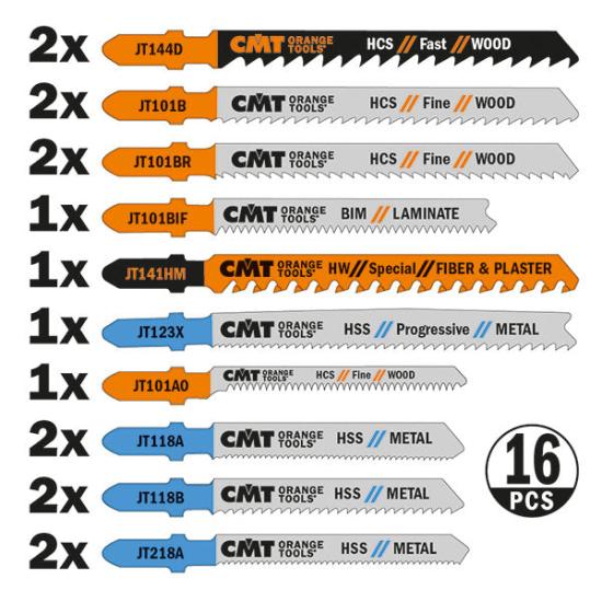 An assortment of 16 Jig Saw Blades featuring the 10 most popular blades for a variety of cutting needs