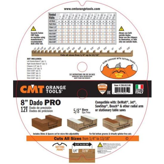 CMT Orange 8" Precision Dado Blade Set, 12 teeth, FTG+ATB grind 0.125" Kerf 230.012.08