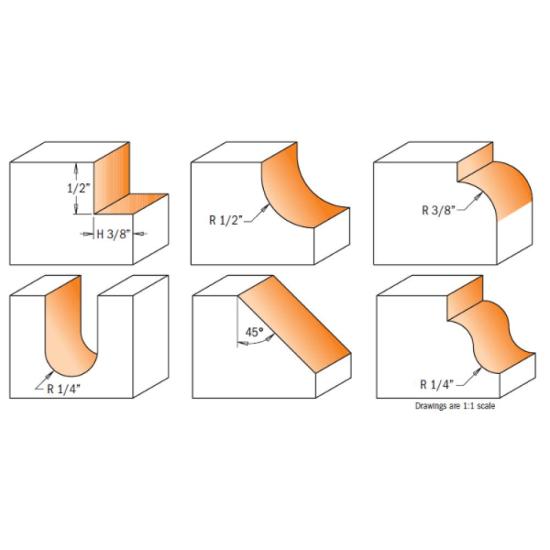 Containing 6 of CMT’s most frequently used 1/2" shank router bits, this compact Italian case is beautiful and convenient for your woodworking needs. All the bits contained feature the finest steel and carbide, plus CMT’s baked-on orange PTFE non-stick coating.