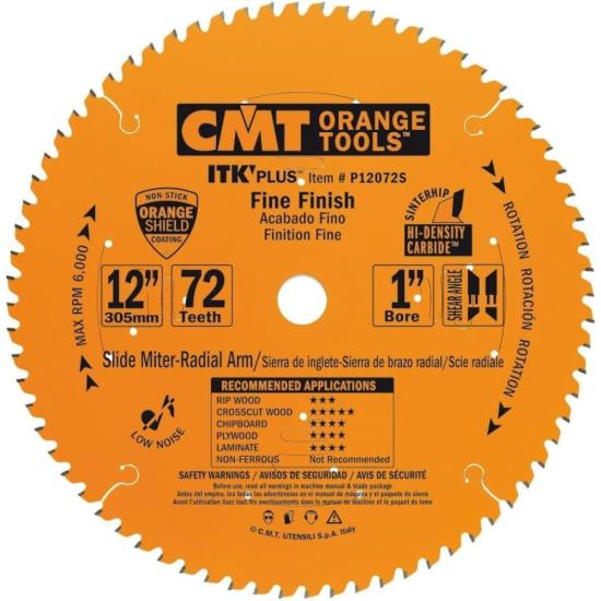CMT Orange Tools CMT ITK PLUS 12" Fine Finish Saw Blade, 72 Teeth, 1" Arbor, Alternate Top Bevel (ATB) Grind with Shear 0.102" Kerf P12072S