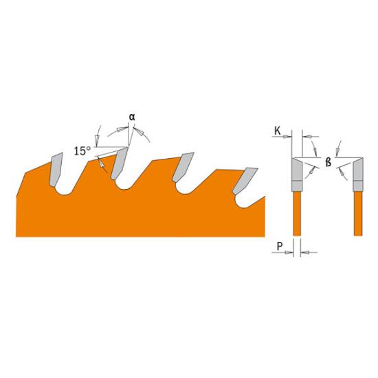This saw blade is part of the CMT ITK Plus line of blades. These blades are designed for professional woodworkers and finish carpenters who run their blades all day long demanding ultimate precision and extended life, while conquering the most challenging applications. The special High-Density Chromium Carbide reduces tooth abrasion and the PTFE (Teflon) coated body protects against rust, corrosion and guarantees long-lasting performance. This blade is designed to be run all day and can cut wood, plywood, MDF, laminates and OSB, The steel plate is laser cut from 46-48 HRC precision German steel to very tight tolerances ensuring longer life and more accurate cuts. The cutting teeth are made from a specially formulated chromium micrograin carbide which stays sharper longer by reducing cutting edge abrasion, improving cut quality and tool life. Each tooth is precision ground on a multi-axis CNC machine creating perfect edge angles and guaranteeing extra-clean cuts and extended life. The Silver-Copper-Silver tri-metal brazing process used to attach the teeth to the saw plate lets the teeth withstand severe impact when cutting harder wood and composite material. The saw plate is coated with Non-Stick Orange PTFE to prevent overheating, protect against corrosion and rust, reduce resin build-up, reduce blade drag, and improve performance and cutting life. The laser cut heat expansion slots are engineered to allow the blade to expand when heat build-up occurs from use, preventing blade warping. The laser cut sound-dampening channels are specifically designed to dampen running noise and control wobbling caused by unwanted harmonic vibration.