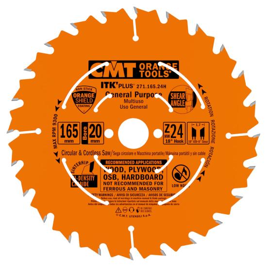 CMT ITK PLUS Track Saw Blade (compatible w/ Makita, Dewalt, Triton), 165mm, 24 Teeth, 20mm Arbor, Alternate Top Bevel (ATB) Grind, 271.165.24H