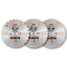 Set of 3 Chrome Carbide 10" Saw Blades - Rip, General Purpose Combo, and Ultimate Crosscutting