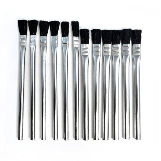 This assortment pack of 12 disposable acid and glue brushes are made of 100% pure black horsehair bristles and have tin metal handles. These economical brushes are perfect for applying a variety of glues and finishes.