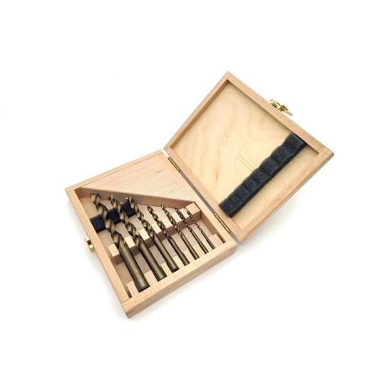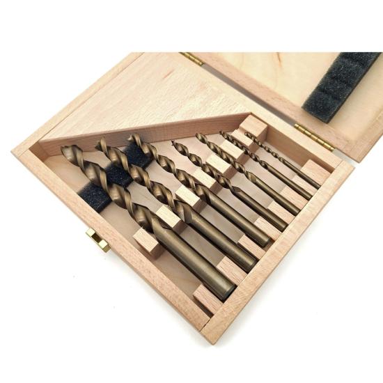 The set includes 3 mm (1/8"), 4 mm (5/32"), 5 mm (3/16"), 6 mm (15/64"), 8 mm (5/16"), 10 mm (3/8"), and 12 mm (15/32") sizes, with overall lengths ranging from 2-1/2" to 6". Larger bits do not have reduced shanks. The set comes in a wood storage box. Made in Germany.