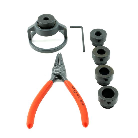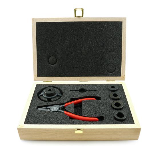 The set comes with the ABS rotating base, supported by a ball bearing, and 5 interchangeable steel bushings, allowing for precise depth control on Forstner bits with a cutting diameter from 10-50mm.