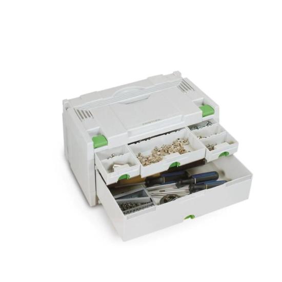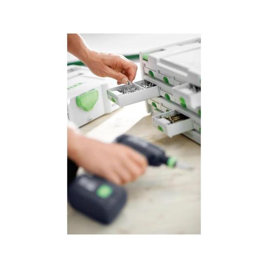 The SORTAINERs are an excellent solution for organization, storage, and transport of fasteners, hardware, and other small project components (screws, washers, nails, nuts and bolts, hinges, knobs and more). All drawers can be accessed from both sides, and each features its own latch, ensuring that drawers don't slide or fall out accidentally. The SORTAINER makes it easy to keep an organized workshop, or take small parts to a jobsite, saving time and improving efficiency. Individual drawers can also be removed from the SORTAINER, making it easy to carry just what you need to the workspace, whether at the top of a ladder or in a tight, confined space. Each drawer features a front recess with protective cover, allowing for the insertion of detailed labels. SORTAINERS seamlessly connect to all Festool SystainerS, SORTAINERS and CT Dust Extractors for secure storage and easy transport. All SORTAINERS include dividers for their respective drawer sizes. Additional inserts are available, allowing you to further customize your storage solution.