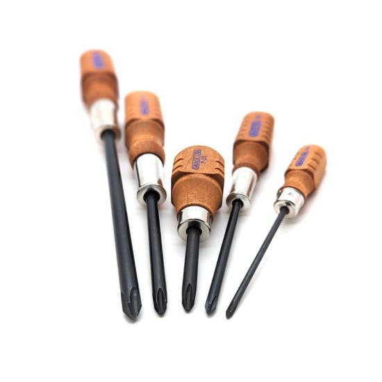 Each screwdriver is constructed of USA 8650 Chromium-Vanadium steel alloy blades, and features a black oxide-finish and is precision made for snug fit between the driver and fastener that minimizes the potential for damage to the screw head when torque is applied.