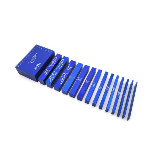 Imperial (inch) : 1/16", 3/32", 1/8", 5/32", 3/16", 7/32", 1/4", 5/16", 3/8", 7/16", 15/32", 1/2", 23/32", 3/4", 1" x 2" x 3"