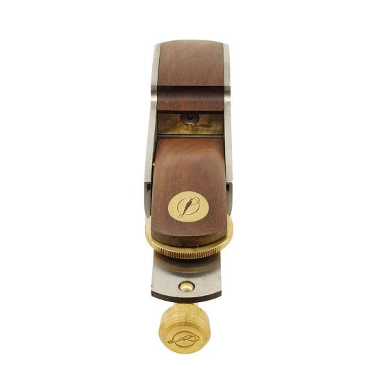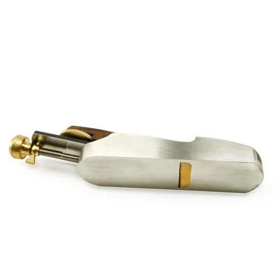 The body of the plane is machined from a single piece of stainless steel, forming the sole, sides, and blade bed as one unified structure. The blade is bedded at 12 degrees and is controlled by both a depth adjuster and a lateral adjuster. Mouth control is achieved through a removable brass insert, allowing the opening to be tuned or modified as required.