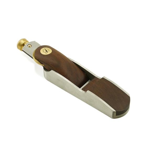 The 12-degree bedding angle makes the plane ideal for end-grain work. As a bevel-up plane, the effective cutting angle can be varied by altering the sharpening angle of the blade, allowing the tool to perform equally well on highly figured or difficult grain. The single-piece stainless steel body, combined with the dense Yarran infill, results in an exceptionally robust plane compared to cast or molded designs. The thick steel sole, rigid sides, and dense wood infill also contribute to the plane’s mass, allowing it to glide smoothly through surface imperfections with ease.