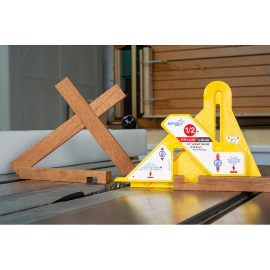The FITFINDER 1/2 Gauge allows you to find the 1/2 thickness of any material up to 3" thick. Create perfectly fitting joints with zero guesswork, set fences and transfer cutting depths instantly--all with no math or measuring.