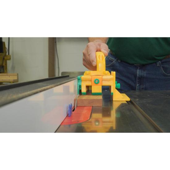The GRR-RIPPER MAX isn't confined to just one tool in your shop. It's designed to work seamlessly across a variety of woodworking machines. On the table saw, it acts as a moving blade guard, offering unparalleled protection while allowing you to rip thin strips down to ⅛" with complete control. On the router table, its powerful grip ensures command over your stock, whether you're using the fence or freehand routing. When used on the jointer, the GRR-RIPPER's Green GRR-RIP® material provides the traction you need for safe and effective face-jointing. Its ability to maintain a constant 90-degree angle on the band saw reduces blade drift, resulting in smoother, more accurate resawing.