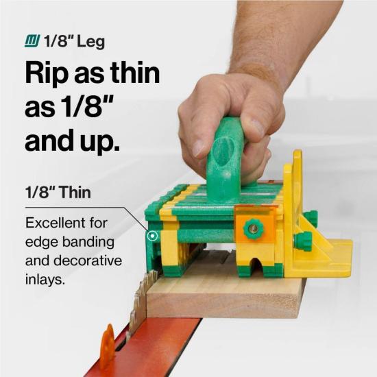 3. Make cuts other pushblocks can’t touch. With the 1/8" and 1/4" Legs, you can rip strips down to a true 1/8" × 1/8". The Balance Support keeps the GRR-RIPPER stable on narrow stock, while the Stabilizing Plate locks material parallel to the fence like a featherboard—without side-loading toward the blade. Together with the X-AIR and Gravity Heels, you get clean, controlled cuts from the thinnest inlays to tall resawn boards, safely and repeatably.