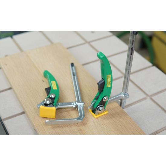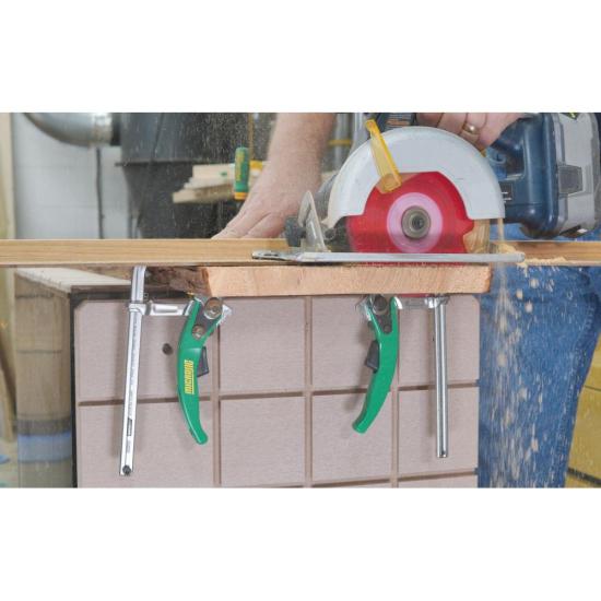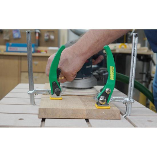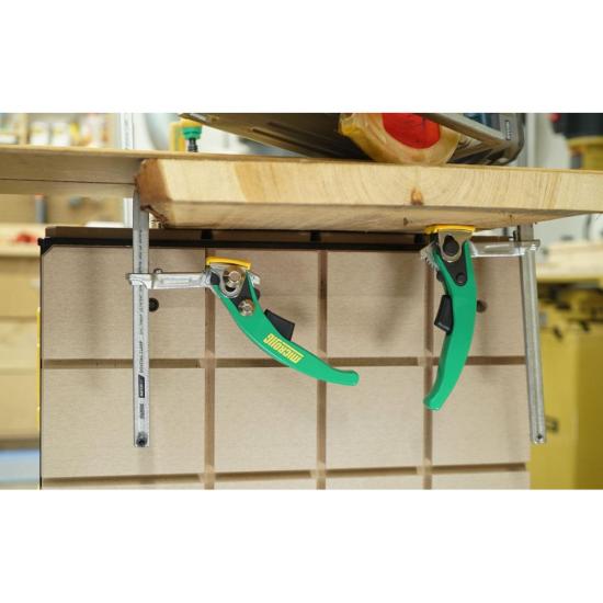 Most clamp arms are free to fall down when released forcing you to reset them every time you secure them, but not Microjig’s Ratchet Clamp. Their exclusive “Anti-Pivot” AP Spring holds the arm where you set it. Now you can release the pressure, move your stock, and reclamp without needing to adjust the arm, upside down or right side up.