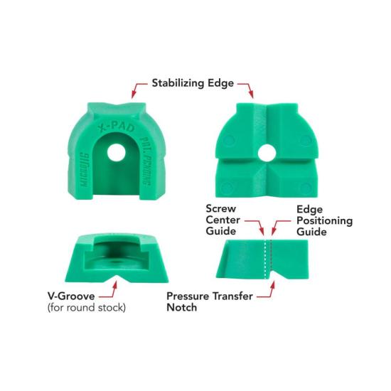 The V-groove profile gives you two points of contact to clamp. Simply turn the X-PAD 90° to clamp round and oblong-profile stock with a single clamp.