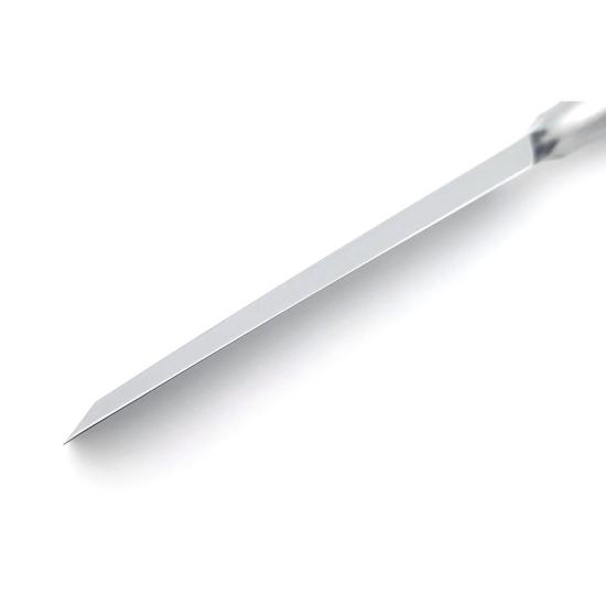 Richter chisel blades are made from the highest quality Chrome Vanadium (Cr-V) steel using traditional drop-forging methods. Blades are then hardened, cryogenically treated and tempered to achieve a minimal hardness of 62 HRc. Subsequent fine-grinding and polishing ensure a mirror-like surface with ultra-thin sides allowing reach into very tight spaces, making them the perfect chisel for cleaning out dovetails. The front bevel is ground at 24 degrees.
