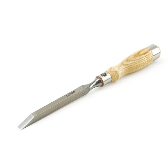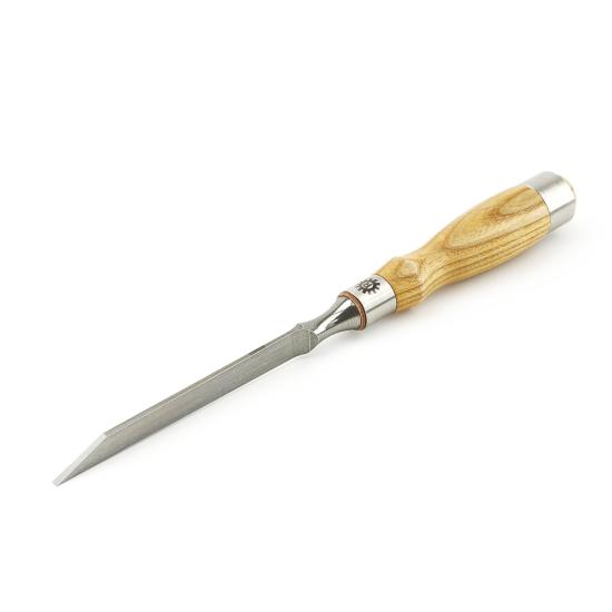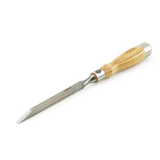 Richter Extra mortise chisel blades are made from high-quality Chrome Vanadium (Cr-V) steel as the Richter bench chisels using traditional drop-forging methods. They are hardened, cryogenically treated, and tempered to a hardness of 62 HRc, with fine-grinding and polishing ensuring a mirror-like surface. The blade sides are ground with a small taper from the bevel to the back of the blade and along the length (approx. 1/64th”) to prevent them from getting wedged in deep cuts. The front bevel is ground at 25 degrees, but a higher secondary bevel of 30 to 35 degrees is advisable, especially when working with harder woods.