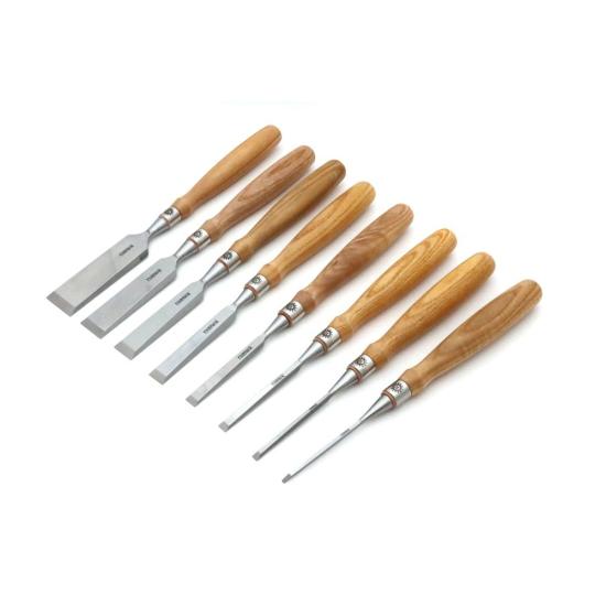 Note: this 8 pc set does not come in a gift box or tool roll. This set contains the following chisels: 1/8", 1/4", 3/8", 1/2", 3/4", 1", 1-1/4", 1-1/2".