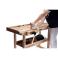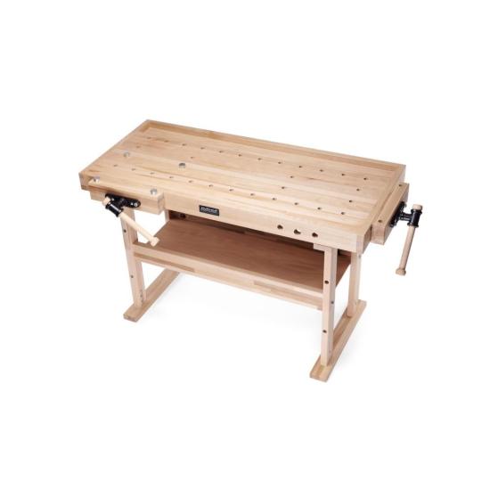 The solid beech benchtop features two rows of 3/4" bench dog holes (32 in total), providing flexibility for clamping tasks no matter where the vises are installed. Additionally, bench dog holes are integrated into the base, allowing for vertical clamping when used with the vise. A robust trestle supports heavy loads, dampens vibration, and resists racking when using hand or power tools or when repositioning the bench around the shop. The trestle comes flat packed and is easy to assemble with dowels, screws and bolts. The full-length tool tray keeps your tools organized and accessible while staying out of the workspace. Additionally, the built-in shelf offers convenient storage for supplies, lumber, or tools. You can even adjust the height of the lower rails on the trestle to customize the shelf storage further. The bench is finished with a non-film, non-slick finish that protects the bench and is easy to restore.