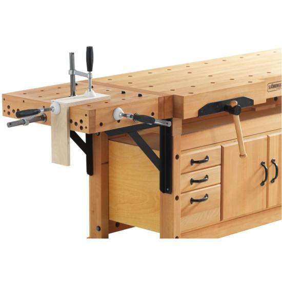 The tops are an impressive 3-3/8” thick with 4-5/16” wide skirts. The two vises, each 29” wide with a 5-3/4” opening capacity, glide along adjustable guide rails to prevent misalignment. The front vise can be moved to the other side of the bench, and the top rotated 180 degrees to accommodate left-handed users. Available in lengths of 1500 (59") and 2000 (79"), with an optional 19" clamping platform. Each model can also be equipped with an optional storage cabinet (SM04).