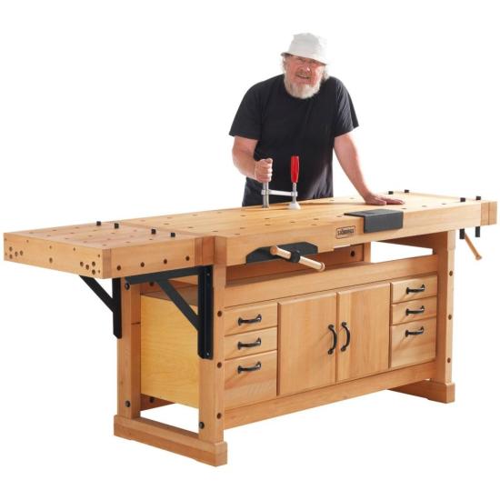 This 2500C model includes an extension Clamping Platform to create nearly 8 feet of work surface. The worktop and extension are constructed using full-length laminations of knot-free European beech, without unsightly splices, and the preassembled trestle frames are also solid beech. Treated with top-quality oil, these benches are built to last for generations.