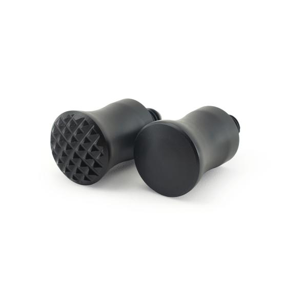 A muddler is used to mash cocktail ingredients such as fruits, herbs, and spices, releasing their distinct flavors. This set includes two muddler heads—one smooth and one textured—made from black Delrin, a hard, durable plastic commonly used in food-contact applications.