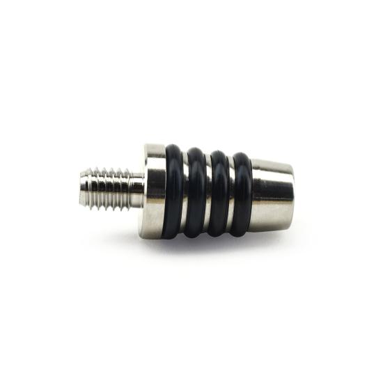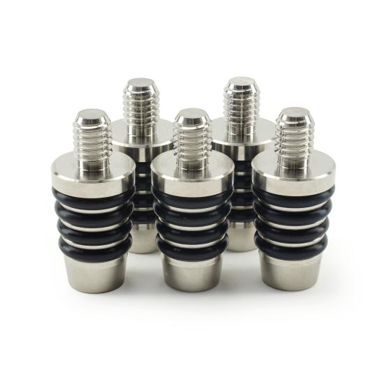 Installation is simple: insert the stopper while gently twisting to create a secure friction fit. The design uses four nitrile O-rings, with two O-rings making full contact inside the bottle neck, providing a tighter seal than tapered stopper designs, which typically allow only one O-ring to contact the bottle interior. The stopper has a 13/16″ top diameter and measures 1-1/4″ tall (excluding the threaded stud).