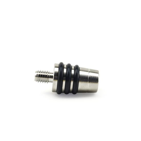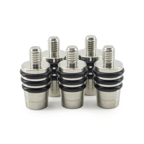 This small whiskey stopper features a top diameter of 13/16″ and uses three O-rings for a secure seal. The top O-ring measures 7/8″ in diameter, while the bottom O-ring measures 13/16″ (see illustration for reference). The stopper is machined from solid 304 (18-8) stainless steel and fitted with three durable nitrile O-rings.