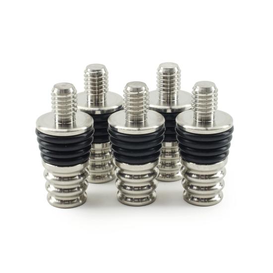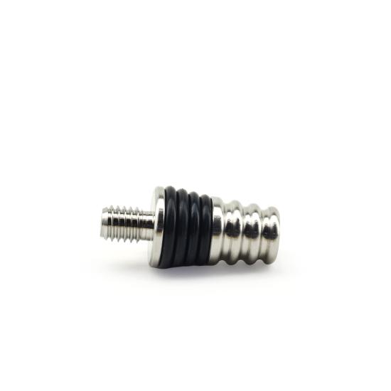 Installation is simple: insert the stopper while gently twisting to create a secure friction fit. The design uses four nitrile O-rings, with two O-rings making direct contact inside the bottle neck for a dependable seal. The stopper has a 13/16″ top diameter and measures 1-3/4″ overall length, including the threaded stud.