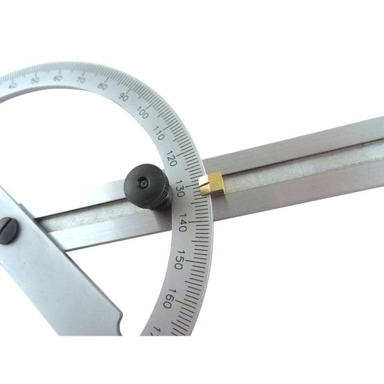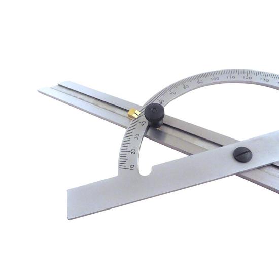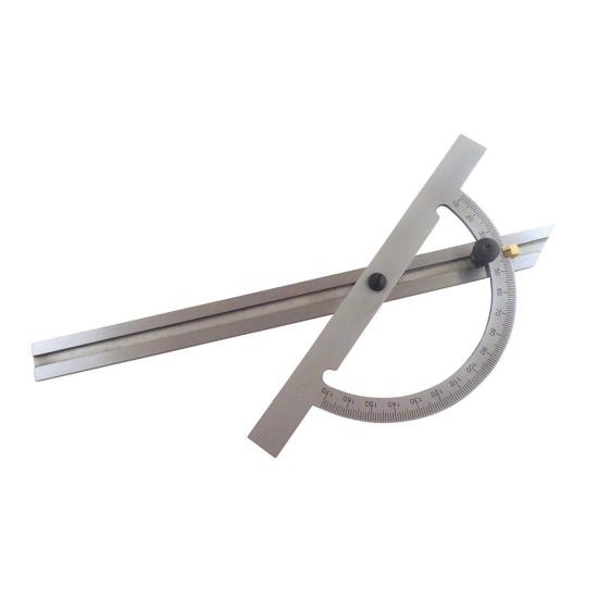 This is a high quality, precision, versatile and heavy duty steel protractor. It measures up to 170 degrees in both directions and the head can slide from one end to the other along a groove in the blade. The locking mechanism holds any angle and will not budge. It is made from hardened tool steel and finished with a “zero glare” satin chrome finish. The blade measures 12" (300mm) in length, with a 8" (200mm) wide protractor head. The blade is 0.140" thick and the head is 0.100" thick. Comes packaged in a protective vinyl sleeve for storage.