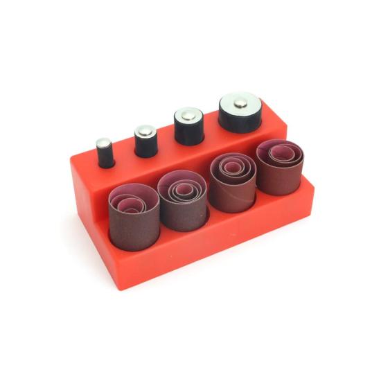 Sand contours and irregular shapes with either a drill press or hand drill Includes four expanding drums in sizes: 1/2" x 2", 3/4" x 2", 1" x 2", 1-1/2" x 2". Includes 2 sets of fine (120X) a...More Details