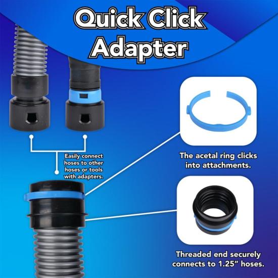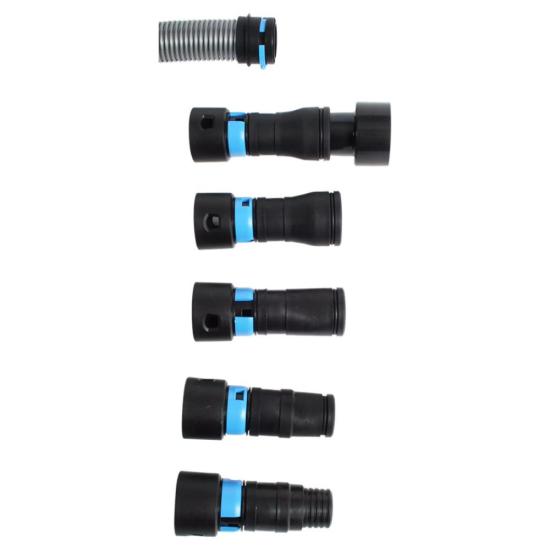 The durable inner collar features an acetal clip ring that locks securely onto many drywall sanders and other high-dust tools. A smooth 360° swivel bayonet connection prevents hose kinking and allows your tool to move freely without restriction. The Quick Click system lets you switch between fittings in seconds-making it easy to move from small-port tools to larger exhaust ports commonly found on routers and miter saws.