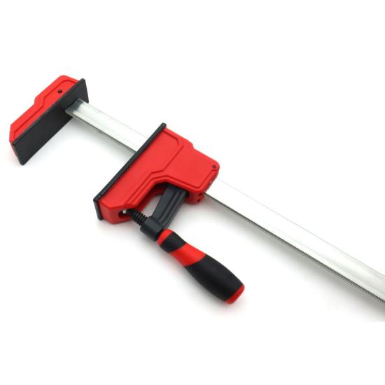 The jaws of these clamps will not free-fall and strike your workpiece (or your hand) when used or stored vertically. The moveable jaws disengage and slide along the rail effortlessly when pressure is released and the handle is lifted. To lock the clamping head securely, simply lower the handle, slide it to the desired position, and apply pressure. The moveable jaw locks onto the serrated steel I-beam via several hardened clutch plates. These clamps generate up to 880 lbs. of clamping pressure.