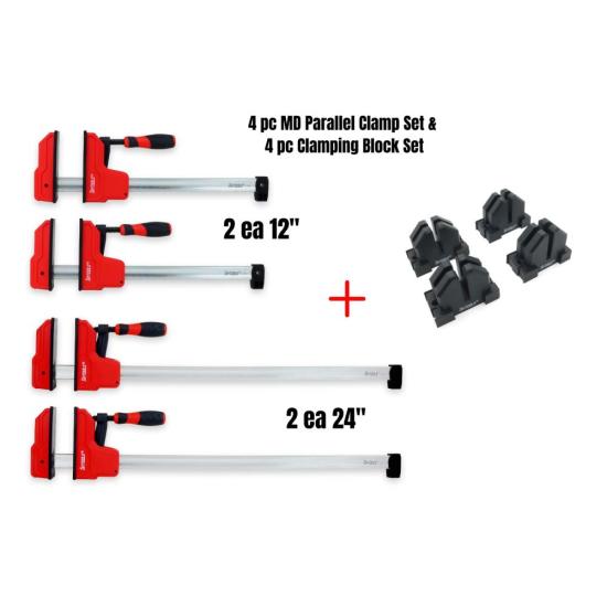 MD Parallel Clamps:These medium-duty clamps deliver the clamping pressure and performance needed by professionals, hobbyists, and DIYers alike. Ideal for everyday woodworking tasks such as gluing panels, assembling casework, boxes, frame-and-panel doors, or any project requiring precise 90-degree clamping to the rail, they ensure square glue-ups every time while preventing parts from bowing. They can also be used with your work parallel to the flat bar rail when clamping longer, flat pieces. Offering all the key features and functionality of our heavy-duty clamps but with reduced clamping pressure—still adequate for most tasks—they provide a lighter, less bulky, and more affordable option for professional results.
