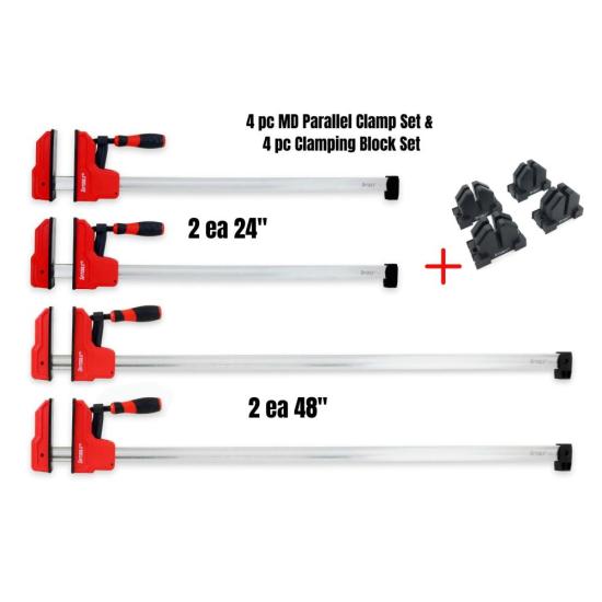 This 4-piece set holds up to four parallel clamps at once, making it perfect for assembling frames, boxes, doors, drawers, and more. For larger projects requiring longer clamps, the dovetail channels at the block ends allow multiple blocks to connect, providing added stability and preventing clamps from tipping during use.