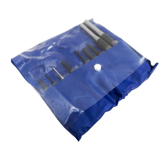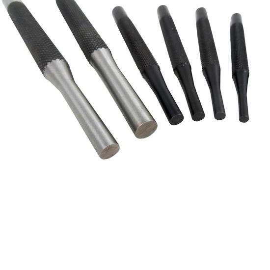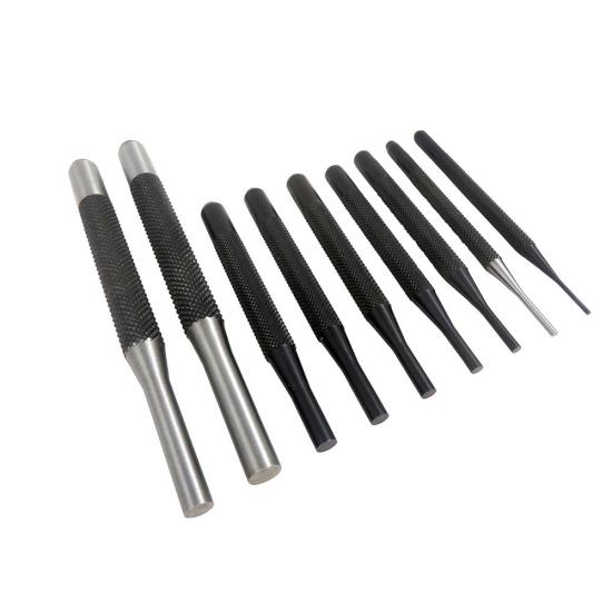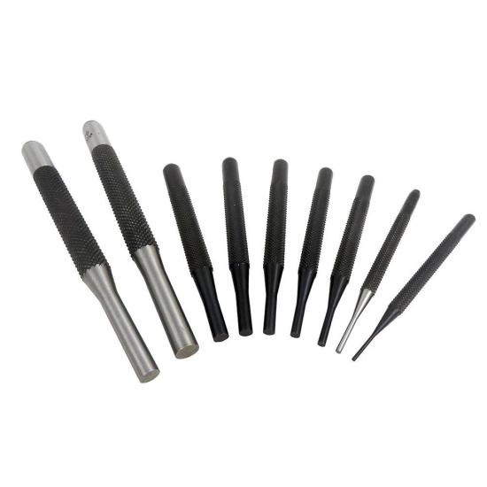 Taytools 9 piece Pin Punch Set with 2 each long (6 inch), 7 each short (4 inch) and automatic center punch set is designed to accurately make holes and drive pins through holes. Each punch is made from hardened and tempered tool steel optimal for strength and durability. Each pin is then ground and polished. Each punch has a heavily knurled handle to provide secure and comfortable gripping.