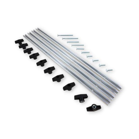Universal T-Track has a unique stacked-slot design that allows you to attach any accessory with 1/4" or 5/16" T-bolts or 1/4" Hex-bolts. Kit come with 4 T Tracks. either 24" 36" or 48" long.