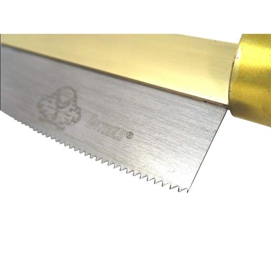 This saw is made by Thomas Flinn of Sheffield England the last traditional saw and plane maker in the UK and co-branded Pax / Taytools. This Veneer Saw with its curved blade is made to slice veneers, enable cuts to be started in the center of a panel of wood and for other inlaying work. Saw plate is 0.015" thick with no set for smooth and controlled cutting. The handle is made from solid Walnut. Blade size is 3" long by 3/4" wide with 15 TPI. Saw plate is made from high carbon allow steel for durability and ease of sharpening. The teeth can be resharpened.