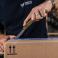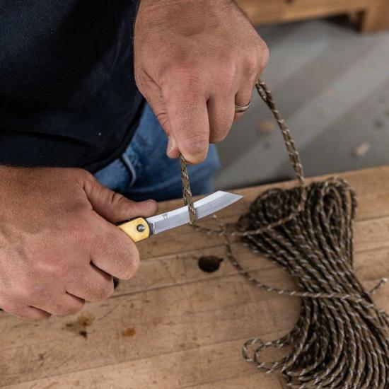 This handcrafted knife features a Scandi grind, tapering from the spine to the cutting edge to create a slim blade profile and an exceptionally sharp edge. Its durable construction and dual bevel make it a versatile, general-purpose knife for shop use. The handle is crafted from folded solid brass for a sturdy, distinctive finish.