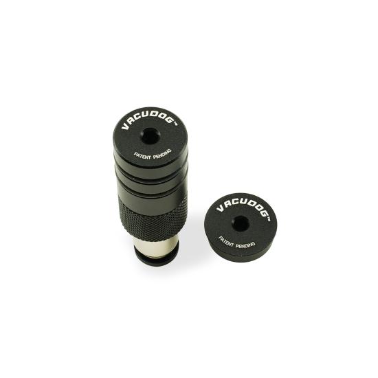 The black anodized aluminum VACUDOG™ works with chamfered and non-chamfered holes and includes two interchangeable caps: