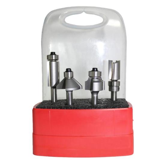 A convenient starter set made up of four popular router bits all in a 1/4" shank. Works well in compact routers or laminate trimmers. The set includes a Template Bit, 45° Chamfer Bit, 1/8" Roundover...More Details